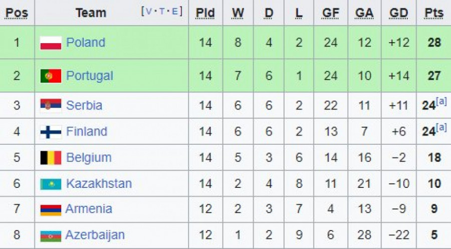 Izabranici Havijera Klementea savladali su na startu Azerbejdžan minimalnim rezultatom 1:0, da bi nakon remija u Varšavi (1:1) usledili uspesi protiv Belgije i Jermenije i šokantan poraz u Almatiju od Kazahstana rezultaom 1:2.