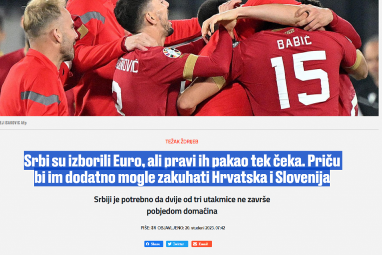 "Sportske novosti" se uz naslov "Srbi su izborili Euro, ali pravi ih pakao tek čeka. Priču bi im dodatno mogle zakuhati Hrvatska i Slovenija" bave ovom temom, a sigurno je da koliko god bi "vatreni" voleli da nam "zakuvaju čorbu", treba da vode računa da pobede uvek nezgodnu Jermeniju, pa da ne ostanu bez plasmana na EP.