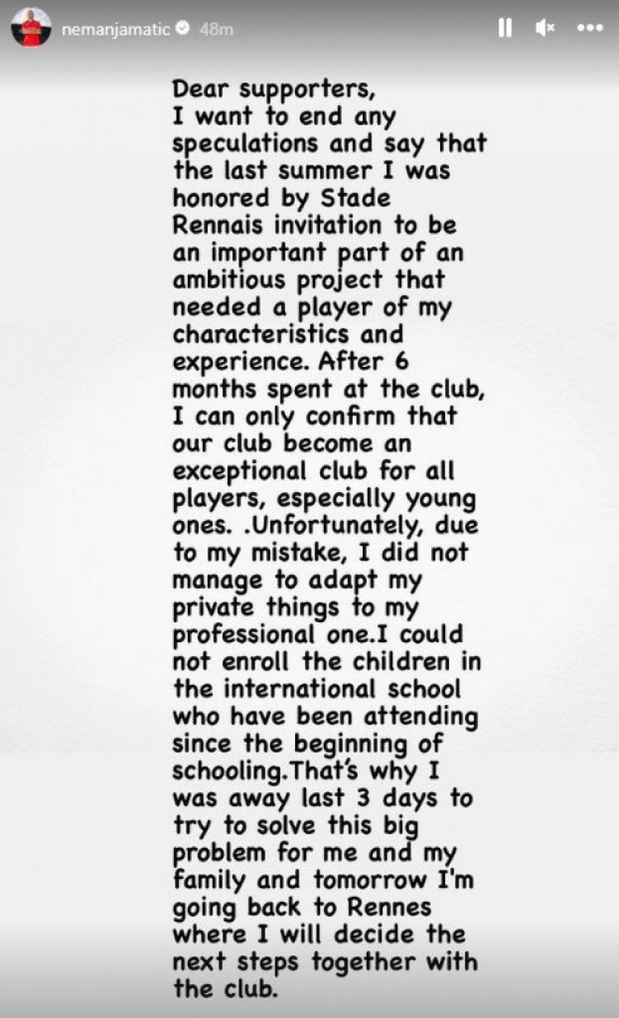 - Dragi navijači, želim da okončam sve spekulacije i kažem da sam prošlog leta bio počastvovan pozivom Rena da budem važan deo projekta kojem je bio neophodan igrač mojih karakteristika i iskustva. Posle šest meseci u klubu, mogu da potvrdim da je klub bio izuzetan za sve igrače, posebno mlade. Nažalost, mojom greškom, nisam uspeo da adaptiram privatne stvari sa profesionalnim. Nisam uspeo da upišem decu u Internacionalnu školu u koju smo želeli od početka godine. To je razlog zbog kojih sam bio odsutan poslednja tri dana kako bih rešio veliki problem za mene i moju porodicu i sutra se vraćam u Ren gde ću odlučiti o novim koracima zajedno sa klubom - naveo je Matić na društvenim mrežama.