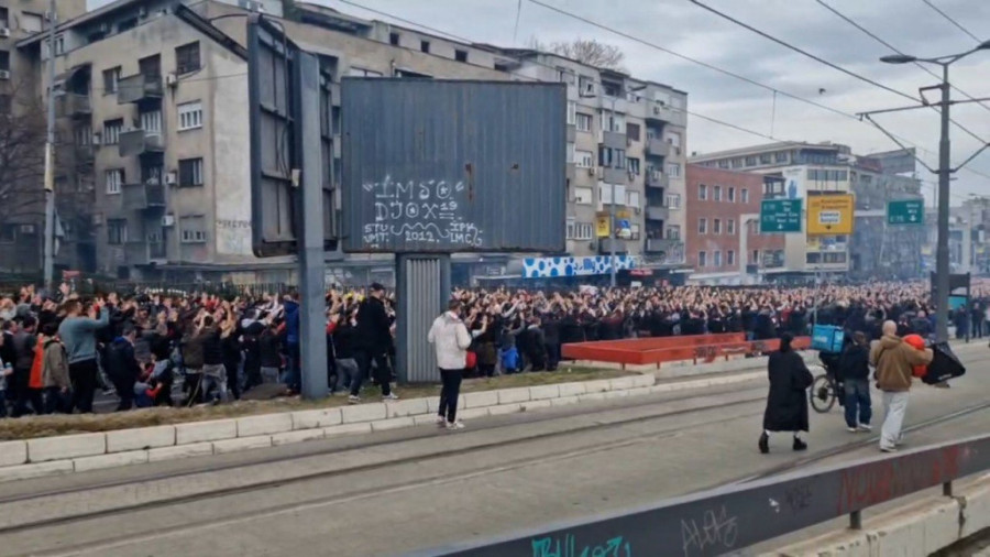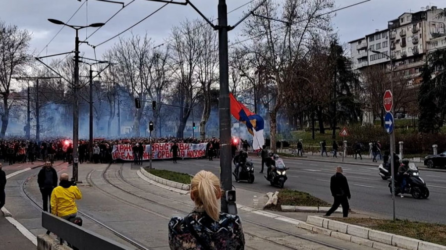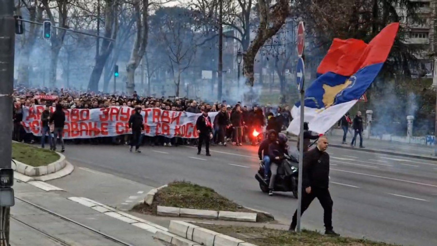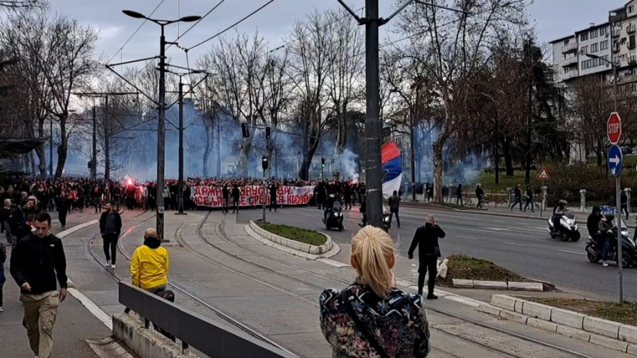"Bacajte bombe, četnici" - uz gromoglasne udare počelo je da se ori oko 14 časova i 20 minuta, dok su pristizali navijači iz pravca Slavije ka onima koji su se ranije okupili u "Karađorđevom parku". Ubrzo je počelo dovikivanje - orilo se Vračarom "KOSOVO!" - "SRBIJA!" Potom je policija ubrzo blokirala prilaze bulevaru, a građani nezadovoljni činjenicom da ne mogu da dođu do kuće ubrzo su krenuli da negoduju. Nedugo nakon toga korteo se uputio ka Marakani, uz veliku parolu na čelu i mnoge zvezdaške pesme.