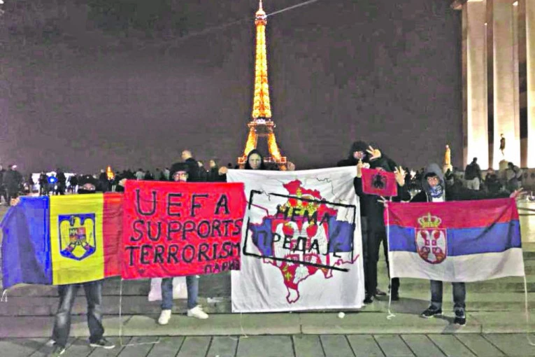 Srpski narod revoltiran zbog nepravdi u vezi sa srpskom zemljom na jugu okupio se i uz pomoć pravoslavne braće Rumuna i Grka skandiranjem i zastavama ispred stadiona obustavio nakratko utakmicu. Francuska policija brzo je reagovala i rasterala okupljene, pa je sve prošlo bez većih incidenata. Ipak, oni su se fotografisali ispred Ajfelovog tornja sa zastavama i transparentom "Nema predaje" sa mapom Kosova i Metohije, kao i "UEFA podržava terorizam". Kako su saopštili putem Fejsbuk grupe "Srbi u Parizu", cilj je bio da vrate Albancima za čuveni dron na stadionu Partizana.