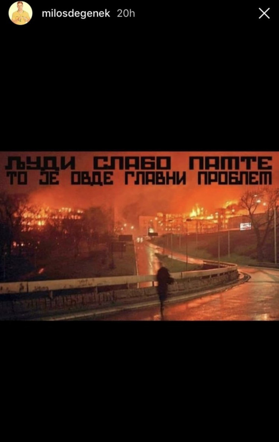Degenek je na svom "Instagram" profilu postavio sliku jednog prizora tokom bombardovanja naše zemlje uz reči: "Ljudi slabo pamte, to je ovde glavni problem’, popularni citat iz pesme grupe Beogradski sindikat – "Oni su".