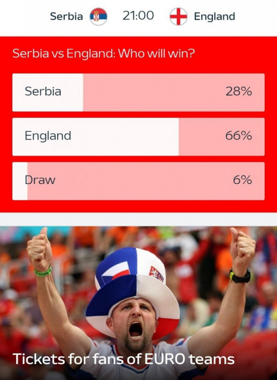 Takmičenje otvaramo 16. juna u Gelzerkirhenu protiv prvog favorita u C grupi - "Gordog Albiona", a navijači širom sveta imaju priliku da prognoziraju ishod, kako ovog, tako i svih mečeva na Prvenstvu Evrope.