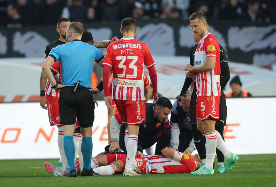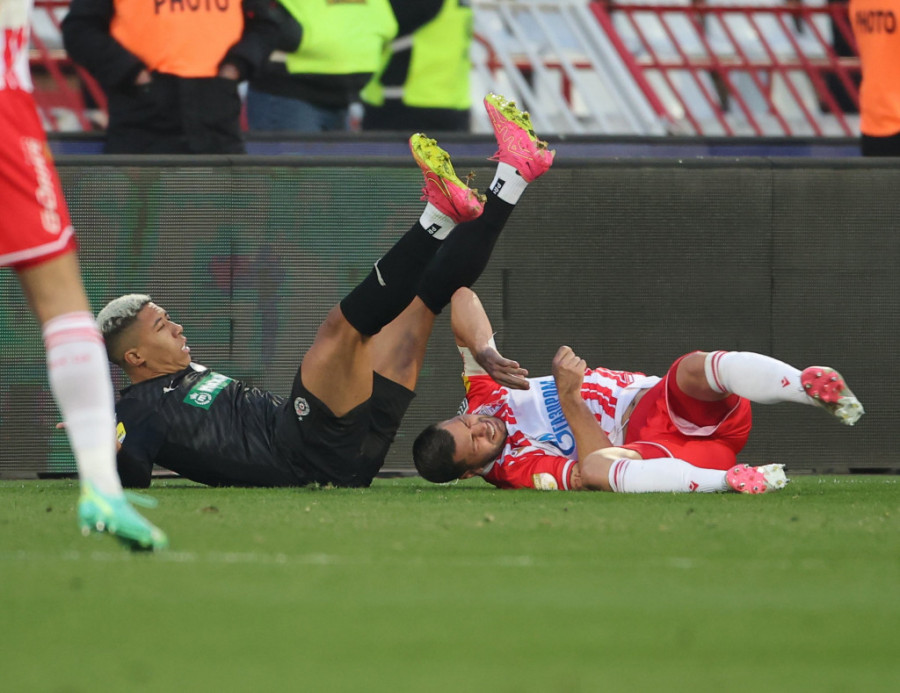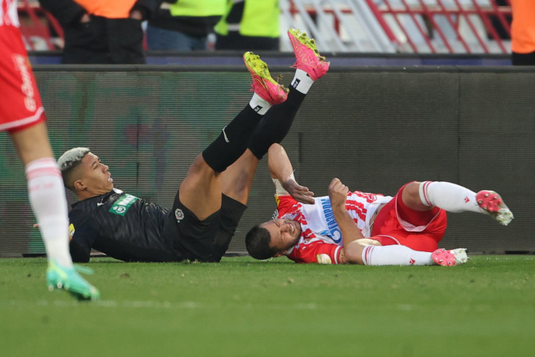 27. minut - Kapiten Zvezde Aleksandar Dragović se drži za rame, pošto je Saldanja pao na njega! Nezgodna situacija, austrijski reprezentativac je završio na travi. Ovo bi mogao da bude problem za Milojevića, jer je njegovo učešće u derbiju ionako prethodnih dana bilo pod znakom pitanja.