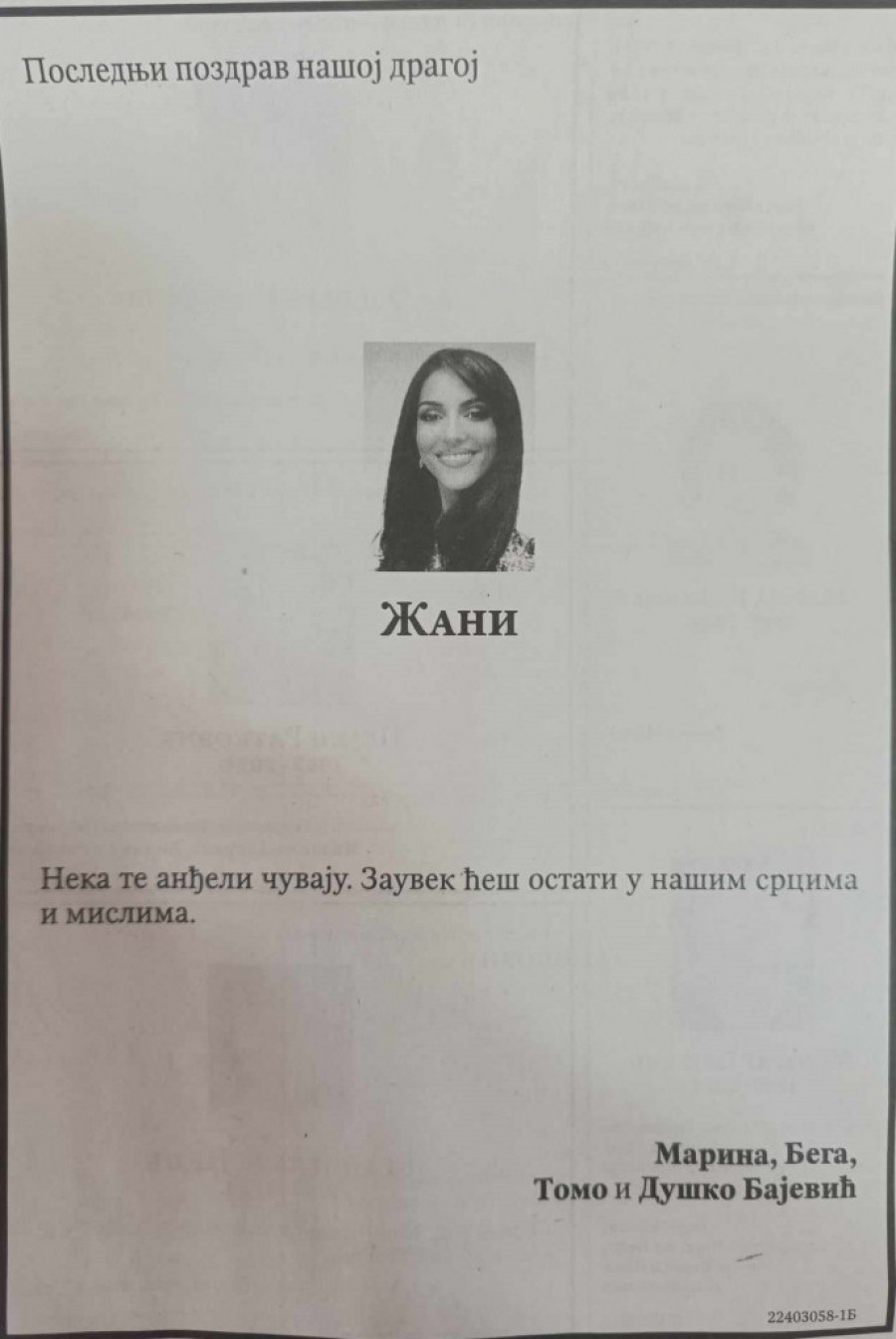 - Poslednji pozdrav našoj dragoj Žani. Neka Te anđeli čuvaju, zauvek ćeš ostati u našim srcima i mislima - stoji u oproštajnoj poruci Duška Bajevića, ispod koje su još potpisani Marina, Bega i Tomo.