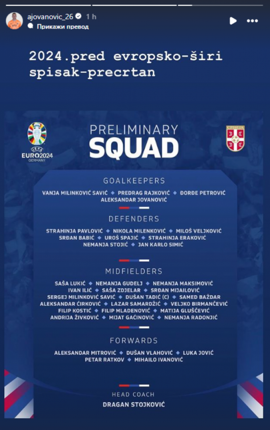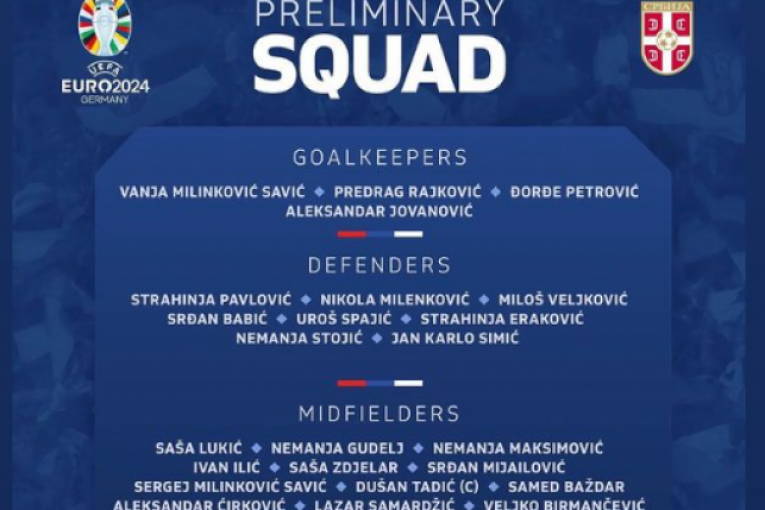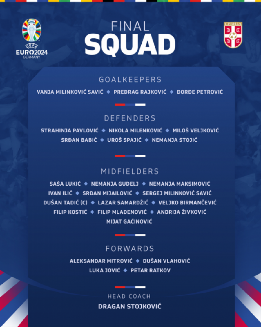 Selektor reprezentacije Srbije Dragan Stojković je objavio spisak od 26 igrača koji će u najboljem svetlu predstavljati našu zemlju na kontinentalnoj smotri u Nemačkoj.