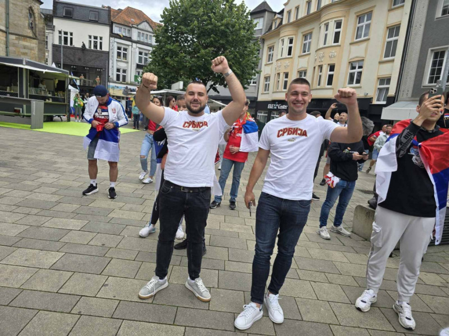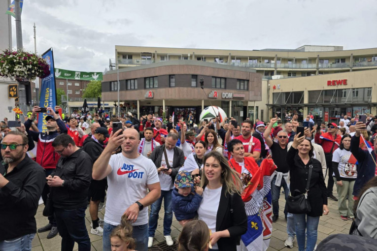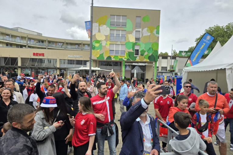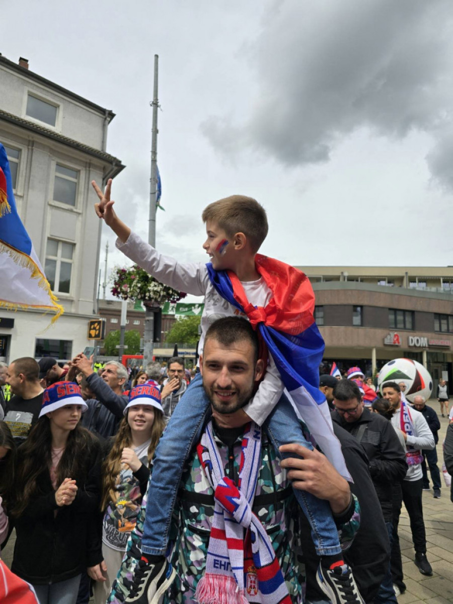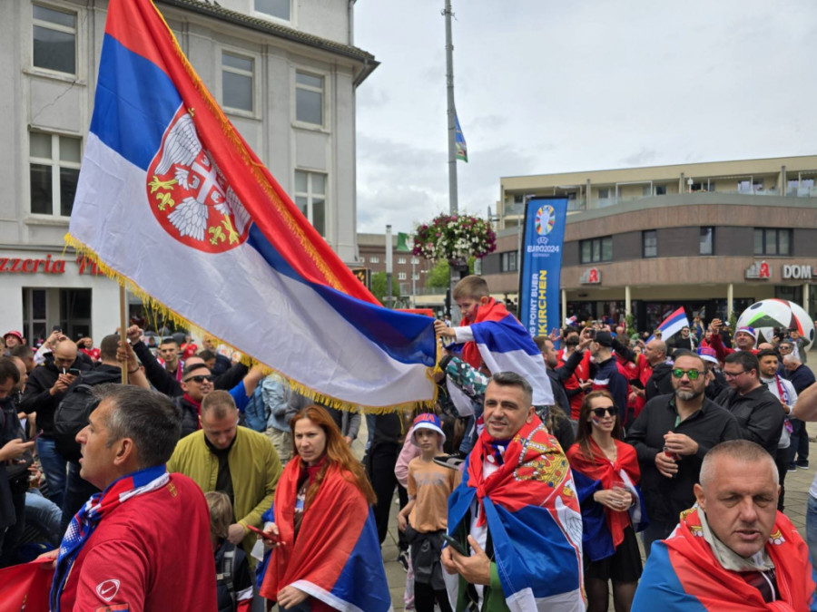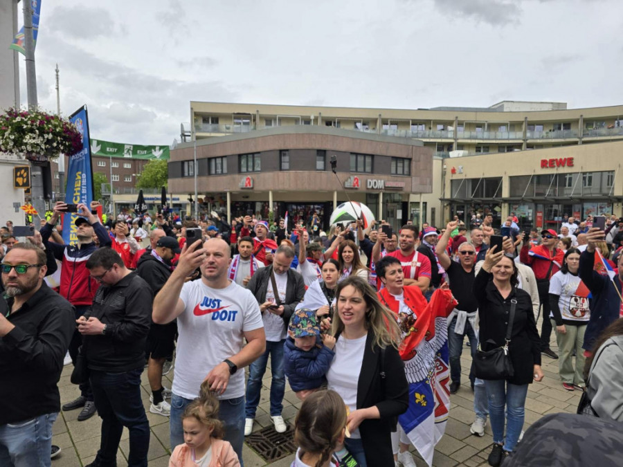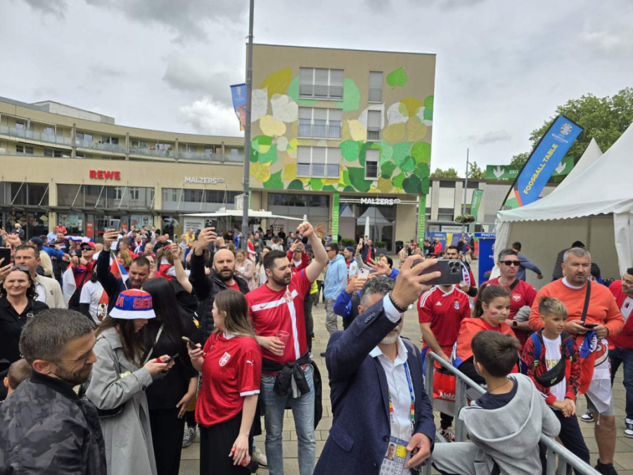 Nemački organizatori potrudili su se da se Srbi osećaju kao kod kuće pa su im spremili toplu dobrodošlicu, sa sve muzikom koja bi mogla da podigne atmosferu do usijanja. I nisu pogrešili. Ceo trg zagrmeo je kada je sa razglasa puštena pesma "Veseli se srpski rode", a zatim i "Vidovdan". Međutim, naši navijači, pogotovo oni iz Republike Srske, koji su i te kako brojni, upali su u ekstasu kada je sa razglasa pušten Baja Mali Kninža i pesma "Pevaj Srbijo".