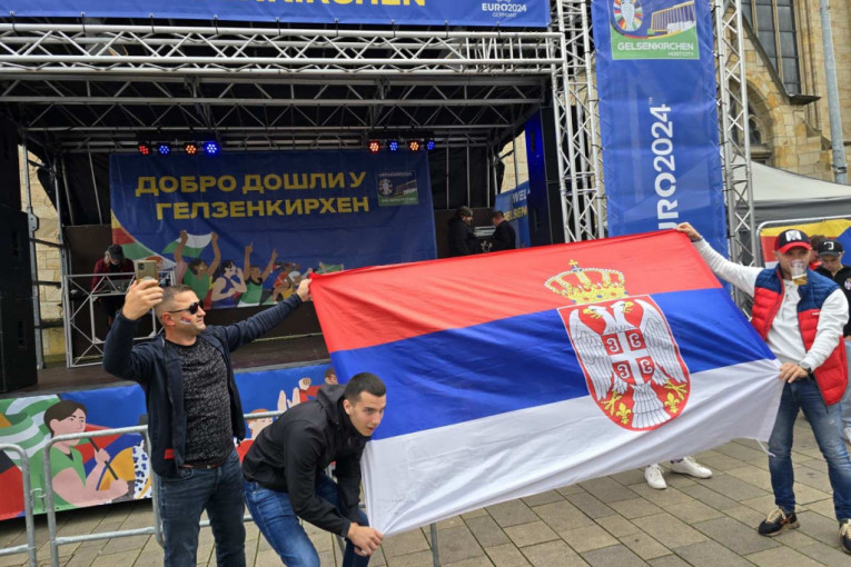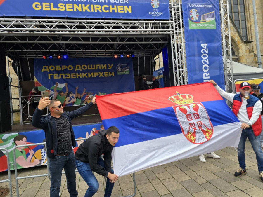 Navijači fudbalske reprezentacija Srbije sjatili su se u Gelzenkirhen iz cele Nemačke, okolnih zemalja, ali i Srbije, Republike Srpske i drugih delova sveta. Naše trobojke vijore se na Sankt urbanus Kirhplacu, trgu na kojem je postavljna fan zona Srbije, udaljena oko 3,5 kilometara od stadiona.