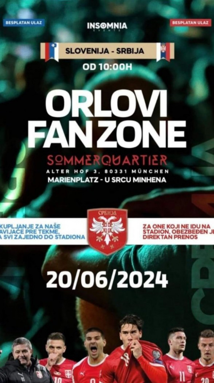 Naš izveštač iz Minhena Dražen Ostojić javlja da su se srpski navijači već organizovali, tako da će okupljanje početi već od 10 časova na Marienplacu u srcu Minhena. Svi oni koji će uživo pratiti predstojeći meč sa tribina "Alijanc Arene" zajedno će krenuti ka minhenskoj fudbalskoj lepotici, dok će oni koji nisu imali sreće da obezbede ulaznicu za duel između Srbije i Slovenije, imati priliku da meč prate u direktnom TV prenosu koji je organizovan.