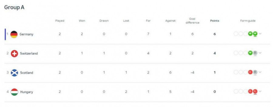 Siguran putnik u osminu finala šampionata Evrope su već pomenuti "panceri", domaćin ima dve pobede, na drugoj poziciji je trenutno Švajcarska sa jednim trijumfom. Treće kolo rešiće mnoga pitanja u ovoj grupi već u nedelju od 21.00 sat.