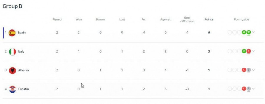 Prva u grupi B je Španija koja je sa šest bodova već obezbedila plasman u nokaut fazu, drugo mesto za sada drži aktuelni evropski šampion Italija, dok po bod u ovoj grupi imaju Albanija i Hrvatska. Mečevi ovih selekcija su na programu u ponedeljak od 21.00 sat i nema sumnje da nas očekuju izuzetno uzbudljivi dueli.