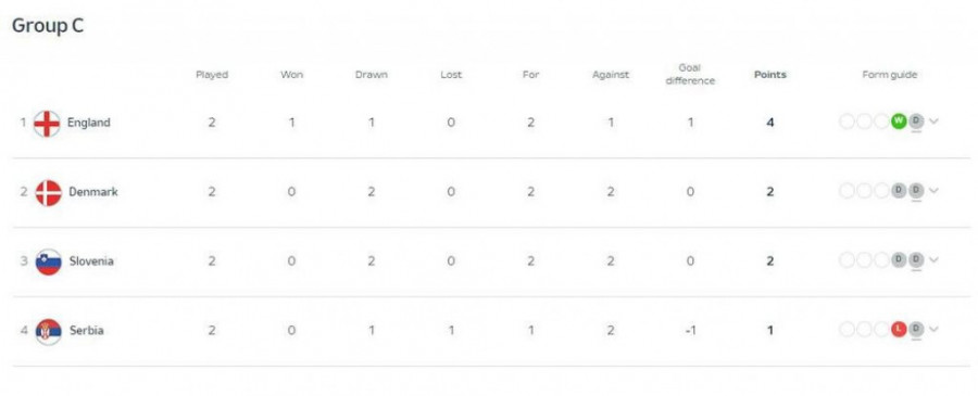 Sve oči naše nacije biće uprte u Grupu C u kojoj se nalazi Srbija! Prvo mesto drži Engleska sa četiri boda, Danska i Slovenija imaju po dva boda, a Piksijevi "orlovi" jedan.