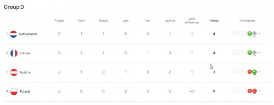 U Grupi D biće neizvesno do poslednjeg sudijskog zvižduka iako su odavno viđeni putnici za osminu finala Holandija i Francuska koje trenutno imaju po četiri boda iz dva odigrana meča. Poljska je sa dva poraza završila učešće na EP, dok Austrija u duelu sa Holanđanima ima priliku da se domogne druge pozicije koja vodi direktno u nokaut fazu. Mečevi trećeg kola ove grupe zakazani su za utorak od 18.00 časova.