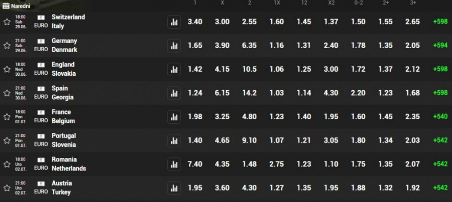 Šesnaest najboljih evropskih selekcija počevši od subote 29. juna krenuće u borbe za plasman u četvrtfinale, a prema kladioničarskim kvotama, čini se da dileme kada je osam najboljih evropskih selekcija u pitanju, nema.