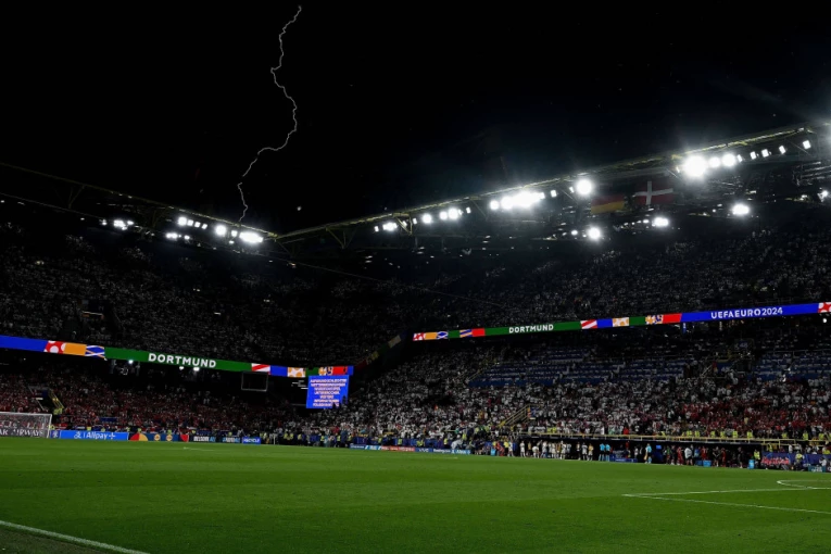 Utakmica na EVRO između Nemačke i Danske bila je na kratko prekinuta zbog nevremena. Grad, velike količine padavina i gromovi iznad Dortmunda primorali su sudiju Majkla Olivera da pošalje fudbalere u svlačionicu dok se sve ne smiri. Foto: www.profimedia.rs