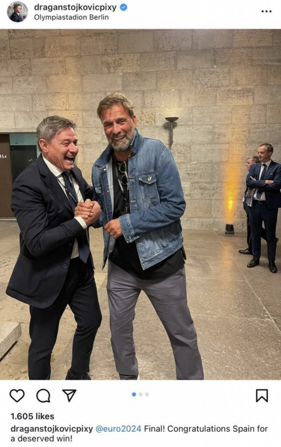 - Finale! Čestitke Španiji na zasluženoj pobedi - napisao je selektor "orlova" Dragan Stojković, koji se na fotografiji nasmejano rukuje sa nemačkim stručnjakom.