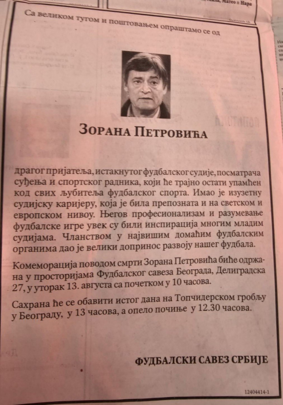 Fudbalski savez Srbije se, takođe, oprostio od legendarnog sudije, biranim rečima: