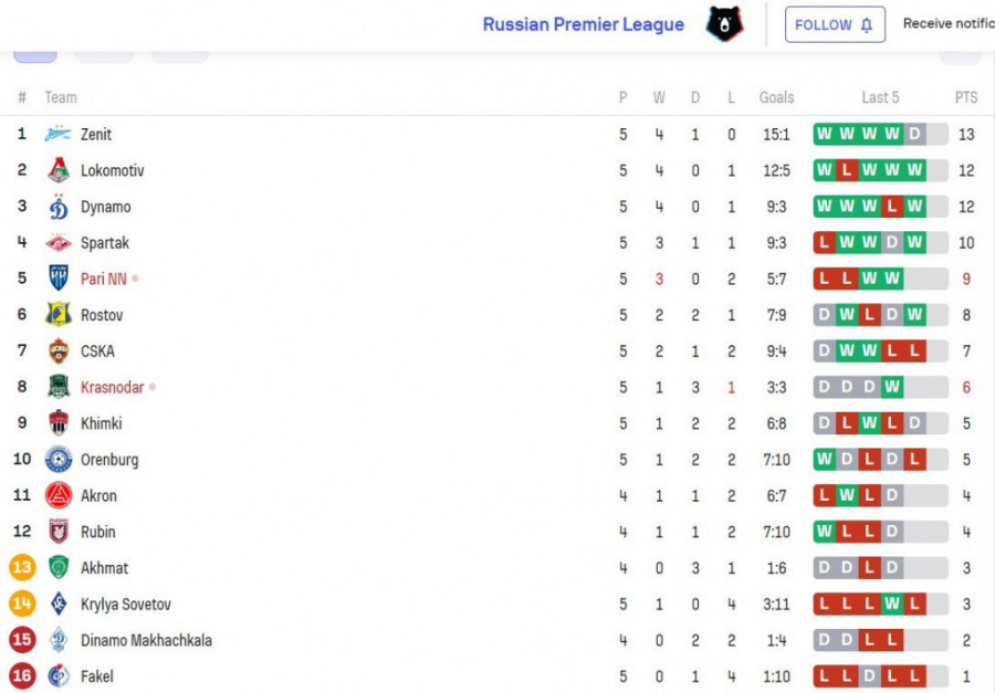 Na tabeli vodi Zenit sa 13 bodova, Spartak je četvrti sa 10, a CSKA na šestoj poziciji sa sedam bodova.