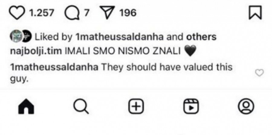 Doskorašnji napadač Partizana, Mateus Saldanja, nije ostao imun na dešavanja u klubu nakon 174. večitog derbija. Odlaskom u Ferencvaroš, Saldanja je ostavio prazninu u napadu Partizana, ali je istakao da je najbolje partije pružao pod komandom Igora Duljaja, koji ga je i doveo u Humsku.