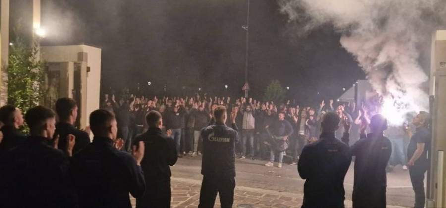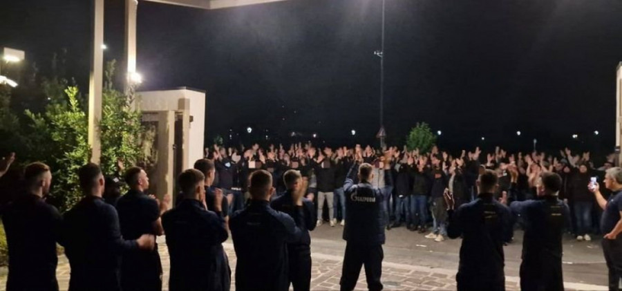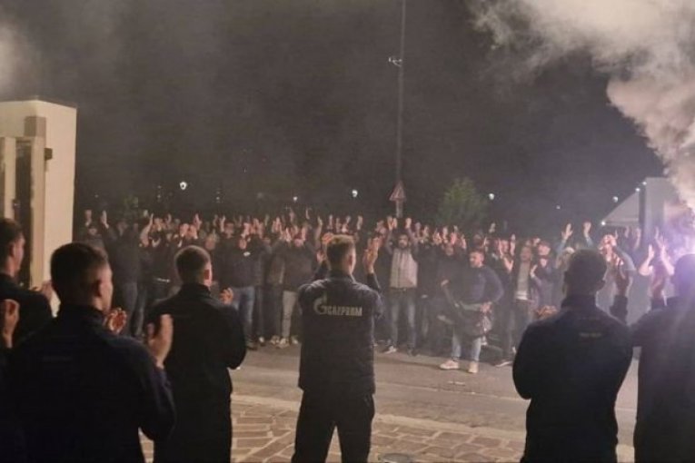 - Ajde, nemojte te smrknute face, došli su ljudi ovde 2.500 km u oba smera, samo da bi vas podržali. Ne mogu da uđu sutra na utakmicu zbog zakona, zbog policije kojoj smo sad pevali, došli su samo da bi vas podržali - glasila je rečinica navijača.