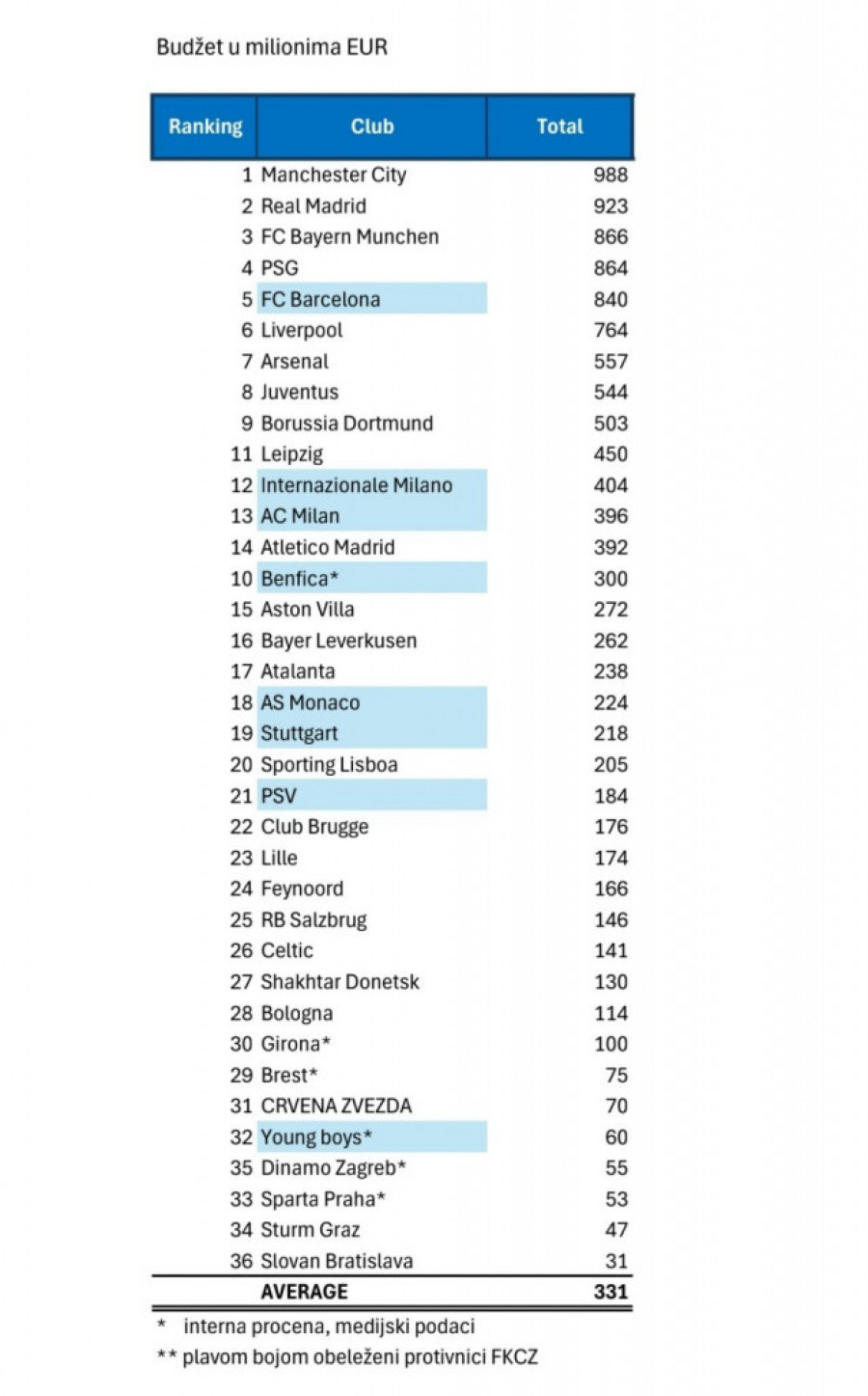 Fudbalski klub Crvena zvezda suočava se sa izazovom nadmetanja sa rivalima u Ligi šampiona, pri čemu se njihov budžet od 70 miliona evra nalazi na 31. mestu među učesnicima ovog elitnog takmičenja. U poređenju sa nekim od najbogatijih klubova, poput Barselone sa budžetom od 640 miliona evra, Zvezda se nalazi u značajnom finansijskom zaostatku.