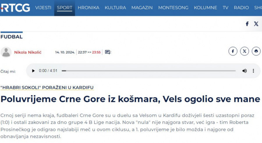 Nakon obećavajućeg starta, crnogorski nacionalni tim doživeo je šest uzastopnih poraza u periodu od juna i oktobra, a kulminacija se dogodia porazom rezultatom 1:0 od Velsa u B diviziji UEFA Lige nacija. Ovaj loš niz forme ostavio je tim sa četiri poraza i gol količnikom 1:6 i već sada se sa velikom sigurnošću može reći da će izabranici Roberta Prosinečkog teško uspeti da se izbore za osptanak u navedenom rangu u konkurenciji Turske, Velsa i Islanda.