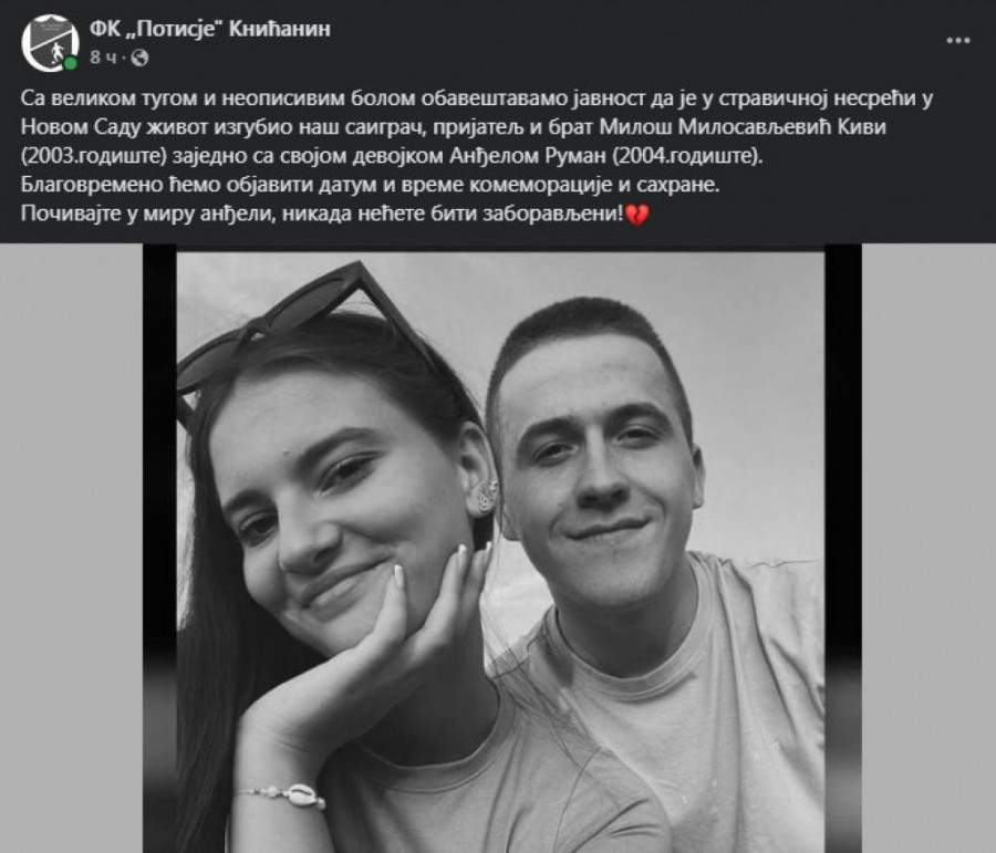 - Sa velikom tugom i neopisivim bolom obaveštavamo javnost da je u stravičnoj nesreći u Novom Sadu život izgubio naš saigrač, prijatelj i brat Miloš Milosavljević Kivi (21) zajedno sa svojom devojkom Anđelom Ruman (20). Blagovremeno ćemo objaviti datum i vreme komemoracije i sahrane. Počivajte u miru anđeli, nikada nećete biti zaboravljeni.