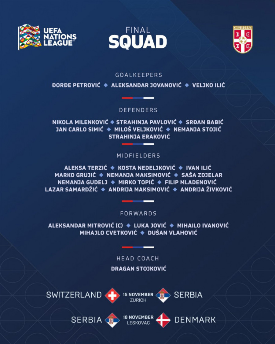 Selektor reprezentacije Srbije Dragan Stojković odlučio je da za predstojeće utakmice Lige nacija, protiv Švajcarske 15. novembra u Cirihu i Danske, tri dana kasnije u Leskovcu.
