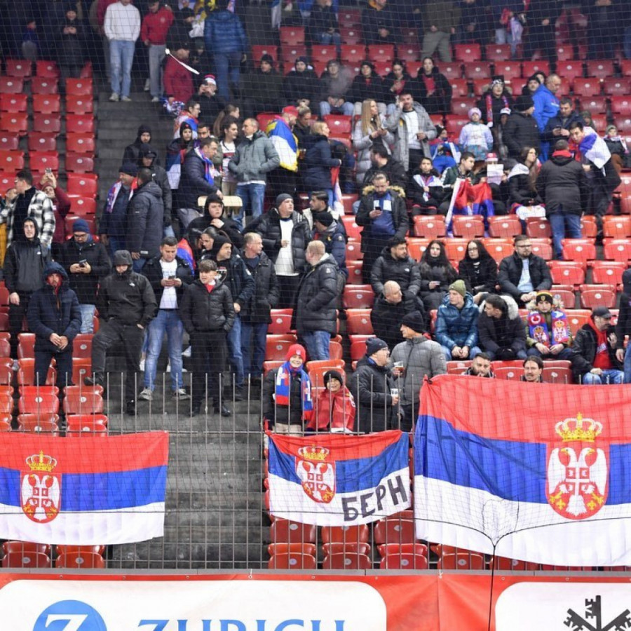 Svoju veliku ulogu imaju i navijači Srbije od samog starta. "Orlovi" igraju kao na domaćem terenu, a to je bilo jasno čim je počela himna "Bože, pravde". Ceo stadion, ili bar njegov veći deo, je zagrmeo. Očigledno je došlo puno naših navijača pa su svi jednoglasno pevali. Kada su završili, Švajcarci su ih izviždali, ali im Srbi nisu ostali dužni na njihovu "neutralnu" himnu. Usledilo je posle i skandiranje "Kosovo je srce Srbije" i to u više navrata, bez ikakve reakcije domaćih navijača među kojima sigurno ima puno Švajcaraca albanskog porekla da bodre Granita Džaku. Nije ih isprovociralo čak ni skandiranje "Ko ne skače taj je Šiptar", a onda i "Srbija, Srbija", a onda i "Kosovo-Srbija".
