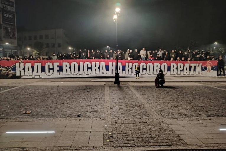 Vatreni navijači Srbije skandiraju "Kosovo je Srbija" u centru Leskovca pred odlučujući meč.