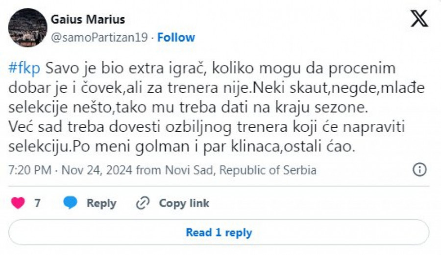 Takođe, ovoga puta j izraženo nezadovoljstvo nedostatkom energije i volje kod tima, uz posebno oštre reči upućene treneru Savi Miloševiću koji se našao na meti kritika navijača.
