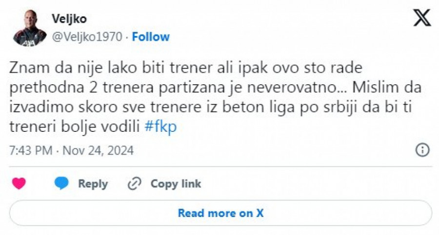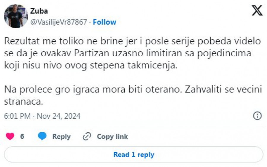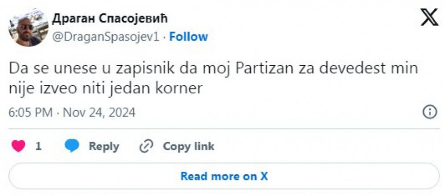 Da podsetimo, Partizan se u ovom momentu nalazi na trećoj poziciji tabele Superlige Srbije. Crno-beli su u 14 prvenstvenih mečeva ostvarili skor od osam pobeda, četiri remija i dva poraza i trenutno imaju 28 osvojenih bodova, bod manje od lučanske Mladosti koja ima dva meča više odigrana, ali sve one kojima su crno-bele boje na srcu više boli podatak da Crvena zvezda već u ovom momentu ima čak 12 (ne)dostižnih bodova prednosti.