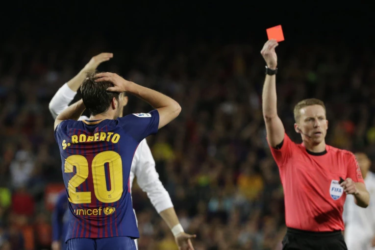 Foto: Tanjug/APSudija Ernandez je pred kraj prvog poluvremena isključio Serhija Roberta, igrača Barselone zbog udaranja Marsela, a to je razbesnelo igrače domaćeg tima.