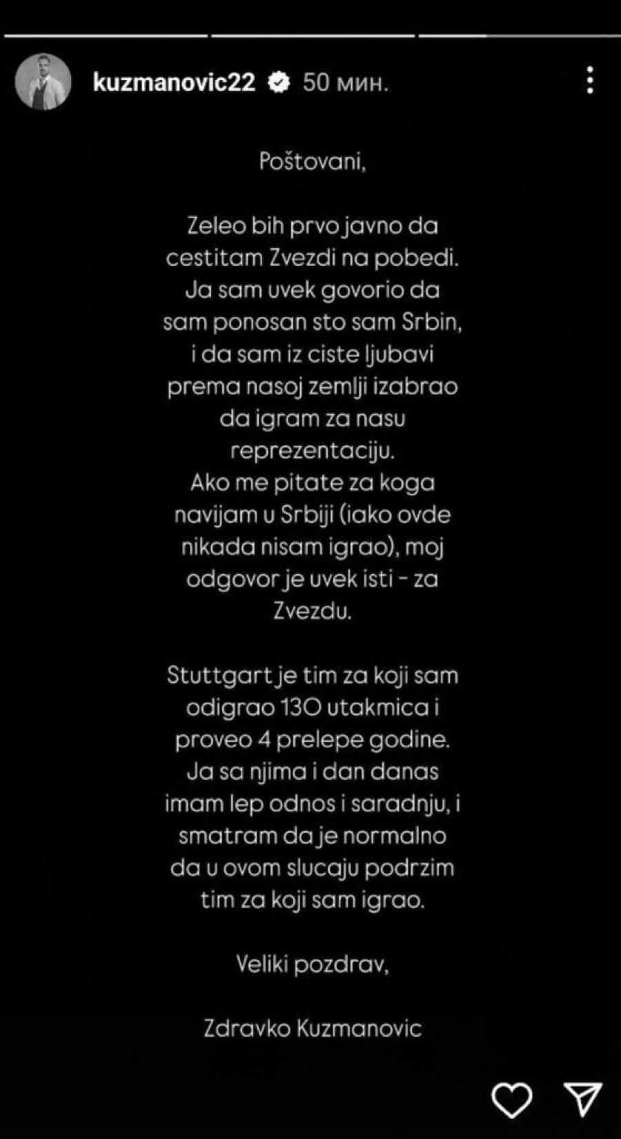 - Štutgart je tim za koji sam odigrao 130 utakmica i proveo četiri prelepe godine. Ja sa njima i dan-danas imam lep odnos i saradnju i smatram da je normalno da u ovom slučaju podržim tim za koji sam igrao. Veliki pozdrav, Zdravko Kuzmanović - ističe Zdravko Kuzmanović.