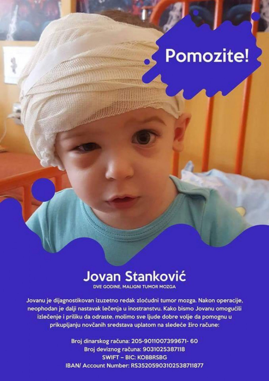 Foto: viberimageDvogodišnjem Jovanu Stankoviću je dijagnostikovan zloćudni tumor na mozgu, a nakon komplikovane operacije potreban je nastavak tretmana terapijama u inostranstvu.