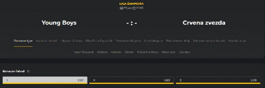 Međutim, samo par sati uoči početka duela u Bernu, bukmejkeri nisu naklonjeni Crvenoj zvezdi. U ovom momentu kvota na trijumf Jang Bojsa iznosi 2,57, dok će svako ko uloži jean dinar na trijumf srpskog šampiona, a ukoliko do njega i dođe, inkasirati 2,70.