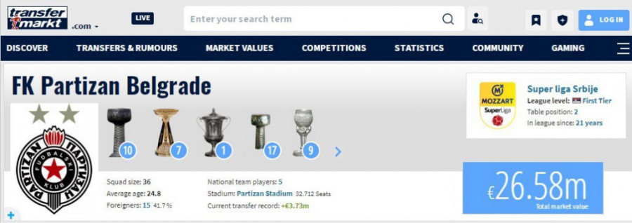 Naime, prema podacima portala "Transfermarkt.com", vrednost kompletnog igračkog kadra Fudbalskog kluba Partizan iznosi 26,58 miliona evra. To znači da bi crveno-beli samo od zarade u UEFA Ligi šampiona mogli da kupe kompletan igrački kadar večitog rivala i da im još ostane pozamašan kusur.