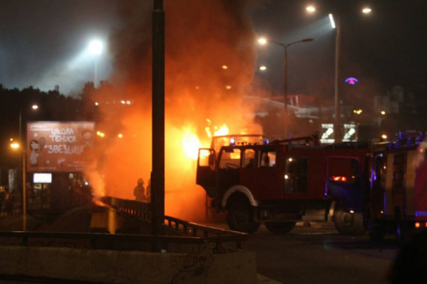 Vatrogasci su brzo stigli do autobusa koji se zapalio izmedu kružnog toka na Autokomandi i raskrsnice ka Južnom bulervaru, i gase požar.