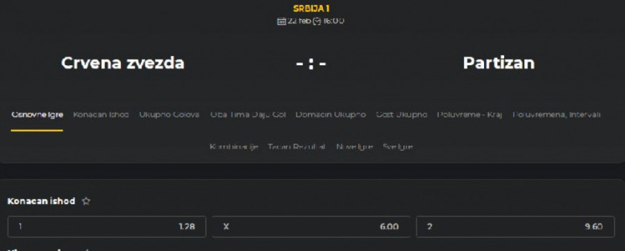 Naime, kvota na trijumf Crvene zvezde iznosi 1,28, dok će svako ko uloži jedan dinar na trijumf Partizana, a ukoliko do njega i dođe inkasirati neverovarnih 9,60. Kada je reč o eventualnom nerešenom ishodu i on je po mišljenju bukmejkera malo verovatan i kvota na "X" u derbiju iznosi 6,00.