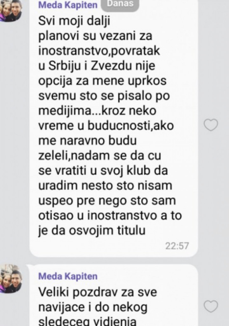 - Svi moji dalji planovi su vezani za inostranstvo, povratak u Srbiju i Zvezdu nisu opcija za mene, uprkos svemu što se pisalo po medijima. Kroz neko vreme u budućnosti, ako me naravno budu želeli, nadam se da ću se vratiti u svoj klub - da uradim nešto što nisam uspeo pre nego što sam otišao u inostranstvo, a to je da osvojimo titulu. Veliki pozdrav za sve navijače Vojvodine - napisao je Medojević.