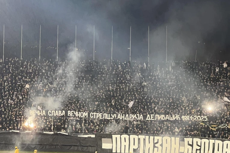 Nakon održanog minuta ćutanja, navijači Partizana su razvukli transpaprent na kome piše "Večna slava večnom strelcu! Andrija Delibašić 1981-2025", pa upalili baklje.