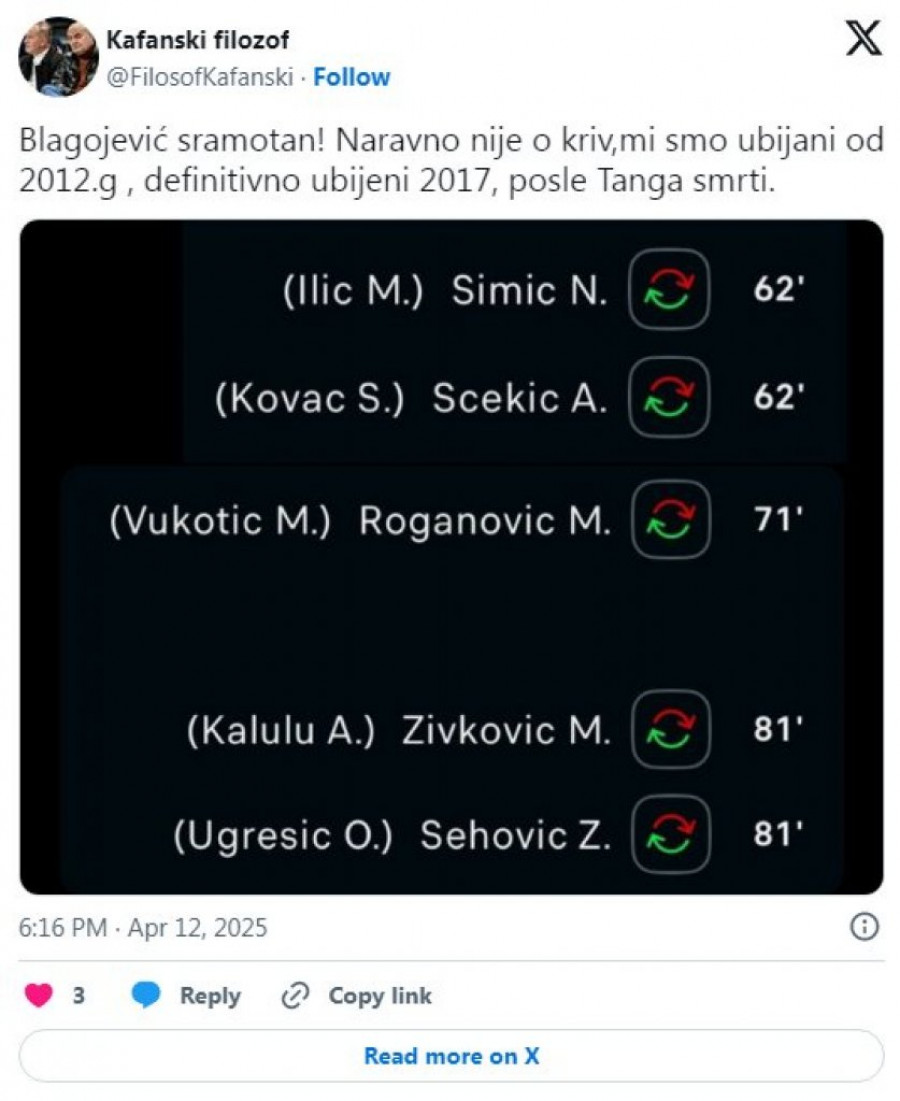 Jedan od ključnih faktora koji je doprineo nezadovoljstvu navijača su izmenama koje je trener Srđan Blagojević izvršio u drugom poluvremenu. Od trenutka kada su zbog povreda izašli Ilić i Kovač, Partizan je izgubio na snazi, a odluka da se u igru uđu bekovi Šehović i Živković, umesto ofanzivnijih igrača, bila je iznenađujuća. Iako je cilj bio očuvati rezultat, upravo su ovi igrači doprineli primanju oba gola u kratkom vremenskom razdoblju. Ova situacija izazvala je brojne kritike na društvenim mrežama, gde su navijači jasno izrazili svoje nezadovoljstvo.