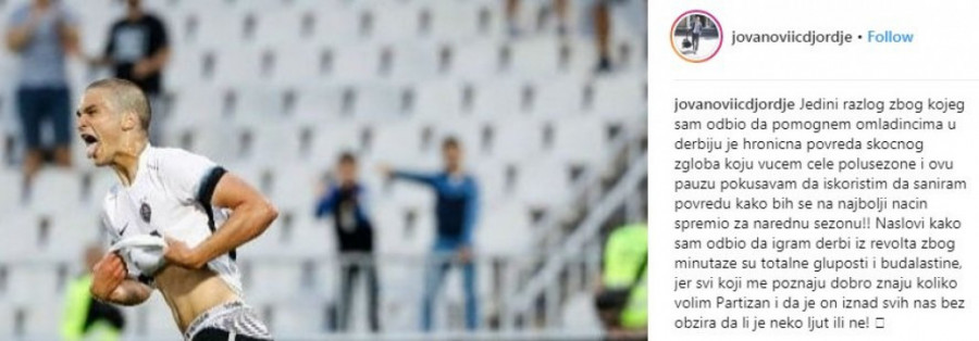 - Jedini razlog zbog kojeg sam odbio da pomognem omladincima u derbiju je hronična povreda skočnog zgloba koju vučem cele polusezone i ovu pauzu pokušavam da iskoristim da saniram povredu kako bih se na najbolji način spremio za narednu sezonu! Naslovi kako sam odbio da igram derbi iz revolta zbog minutaže su totalne gluposti i budalaštine, jer svi koji me poznaju dobro znaju koliko volim Partizan i da je on iznad svih nas bez obzira da li je neko ljut ili ne! - napisao je Jovanović na društvenim mrežama.