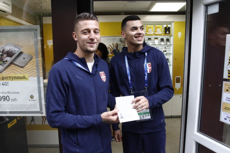 Foto: ST/V. LUKIĆZa kupovinu kartice u Rusiji je potreban pasoš koji fudbaleri nisu imali pri sebi, a na njihovu sreću u blizini se našao fotograf Srpskog telegrafa Vladimir Lukić koji je ponudio svoj pasoš pa su Sergej i Nemanja mogli da pazare bez problema, na šta je igrač Lacija imao dosetljivu pošalicu: