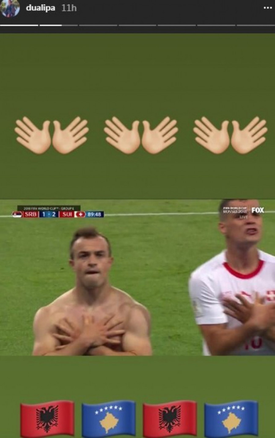 Britanska pevačica albanskog porekla Dua Lipa provocirala je Srbe pošto je na društvenim mrežama objavila sliku kako švajcarski fudbaleri Granit Džaka i Đerdan Šaćiri slavili pobedu nad Srbijom tako što su simulirali "orla" koji se nalazi na zastavi Albanije.