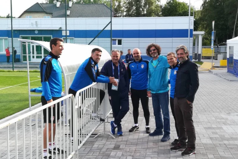 Fudbaleri Srbije imali su posetu pred trening koja je oraspoložila Mladena Krstajića i stručni štab. Savo Milošević i Dragan Ćirić su se pojavili u društvu glumca Dragana Jovanovića koji je svojim humorom vratio osmeh na licu "orlovima" koji su poraženi u drugom kolu Mundijala od Švajcarske, pa će se za nastavak takmičenja boriti sa Brazilom.