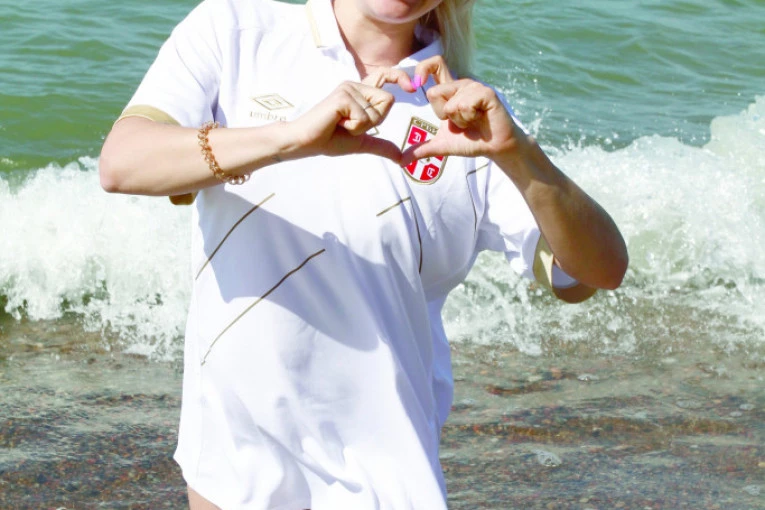 Jedini koji se juče kupao u Baltičkom moru, na svega plus 16 stepeni, jeste mali Dima iz Sevastopolja. Njegova mama Nina se sunčala. Međutim, nije joj bilo teško da nam ispozira u dresu Srbije.