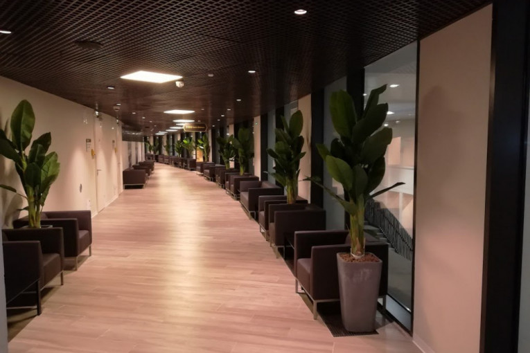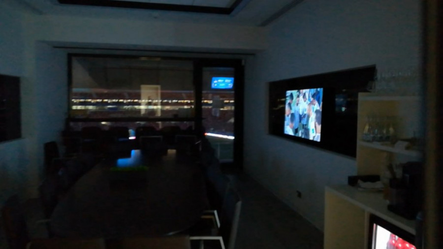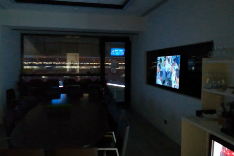 A unutra ugašeno svetlo, nikog nema, samo upaljena dva ogromna televizora. Pun frižider piva i sokova, okrugli sto za 12 ljudi u sredini. Izlaz na svečanu ložu na stadionu. Malo je u ćošku, ali kažu da je ta tačka najbliža terenu, a verovatno u isto vreme i najbezbednija. Strašno i fascinantno lepo u isto vreme!