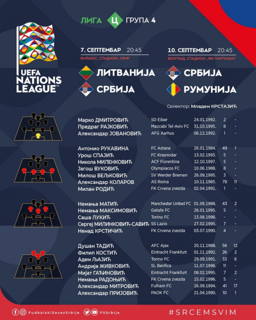 Selektor Srbije Mladen Krstajić uskoro bi trebalo da objavi spisak fudbalera na koje računa za predstojeće duele Lige nacija protiv Litvanije (7. septembar) i Rumunije (10. septembar), a Republika.rs vam ekskluzivno otkriva koji se igrači nalaze na njemu. Strateg "orlova" odlučio je da za naredne mečeve ne računa na starosedeoce Vladmira Stojkovića, Duška Tošića i Branislava Ivanovića, kao i na Luku Milivojevića. U tim se vraća Mijat Gaćinović, a poziv je dobio i Saša Lukić.