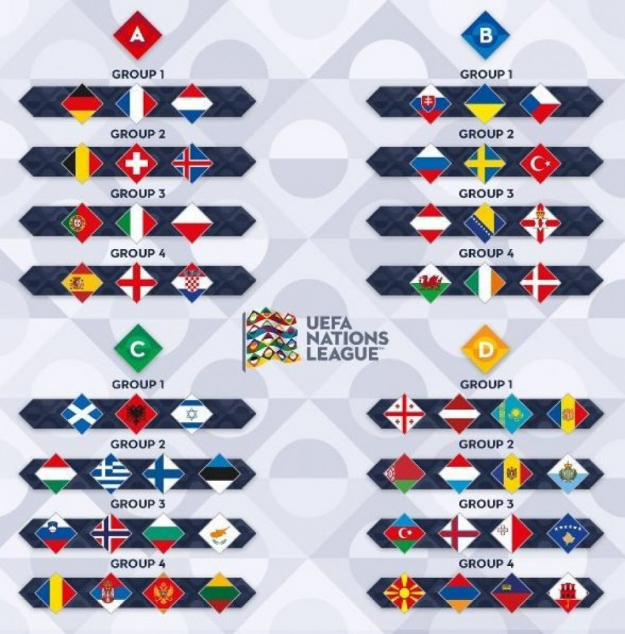 UEFA Ligu nacija igraće 55 reprezentacija, koje su podeljene u četiri lige (A, B, C, D). U Ligi A ima 12 reprezentacija, u Ligi B isto 12, u Ligi C 15 i u Ligi D 16 selekcija. Svaka liga ima po četiri grupe (1, 2, 3, 4). U Ligi A i Ligi B biće četiri grupe po tri ekipe, u Ligi C biće jedna grupa sa tri i tri grupe sa po četiri ekipe, dok će u Ligi D biti četiri grupe sa po četiri ekipe.